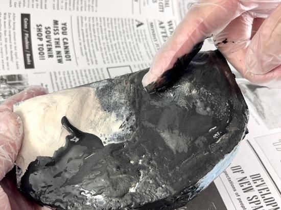専用の接着剤と練り合わせてペースト状にし、擦り付けるように盛ります。